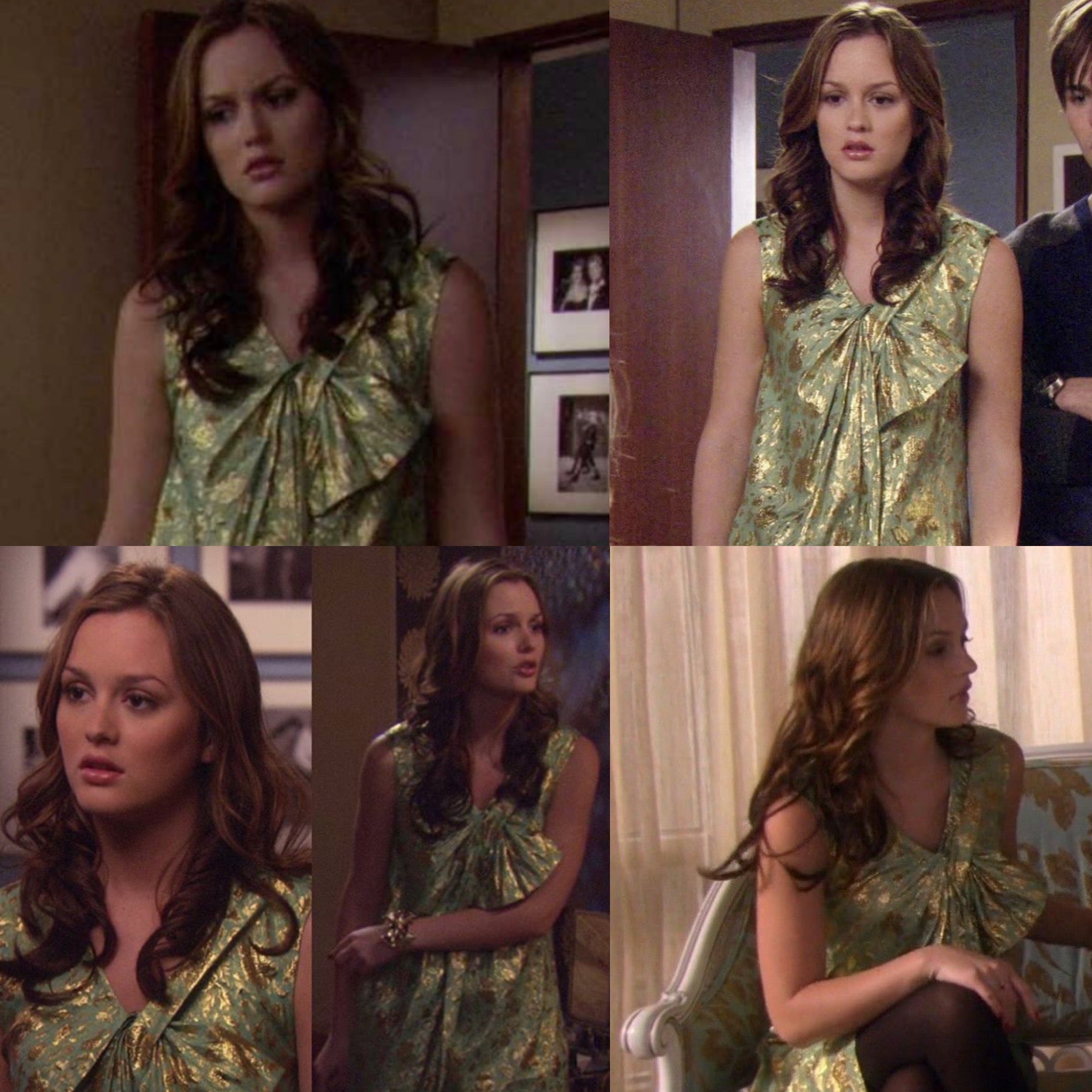 An Upper East Side classic. This original brocade dress was worn by Blair Waldorf (Leighton Meester) in Season 2, during one of her most emotionally loaded arcs — a moment when gilt florals and soft, sculpted volume became her armor of choice.