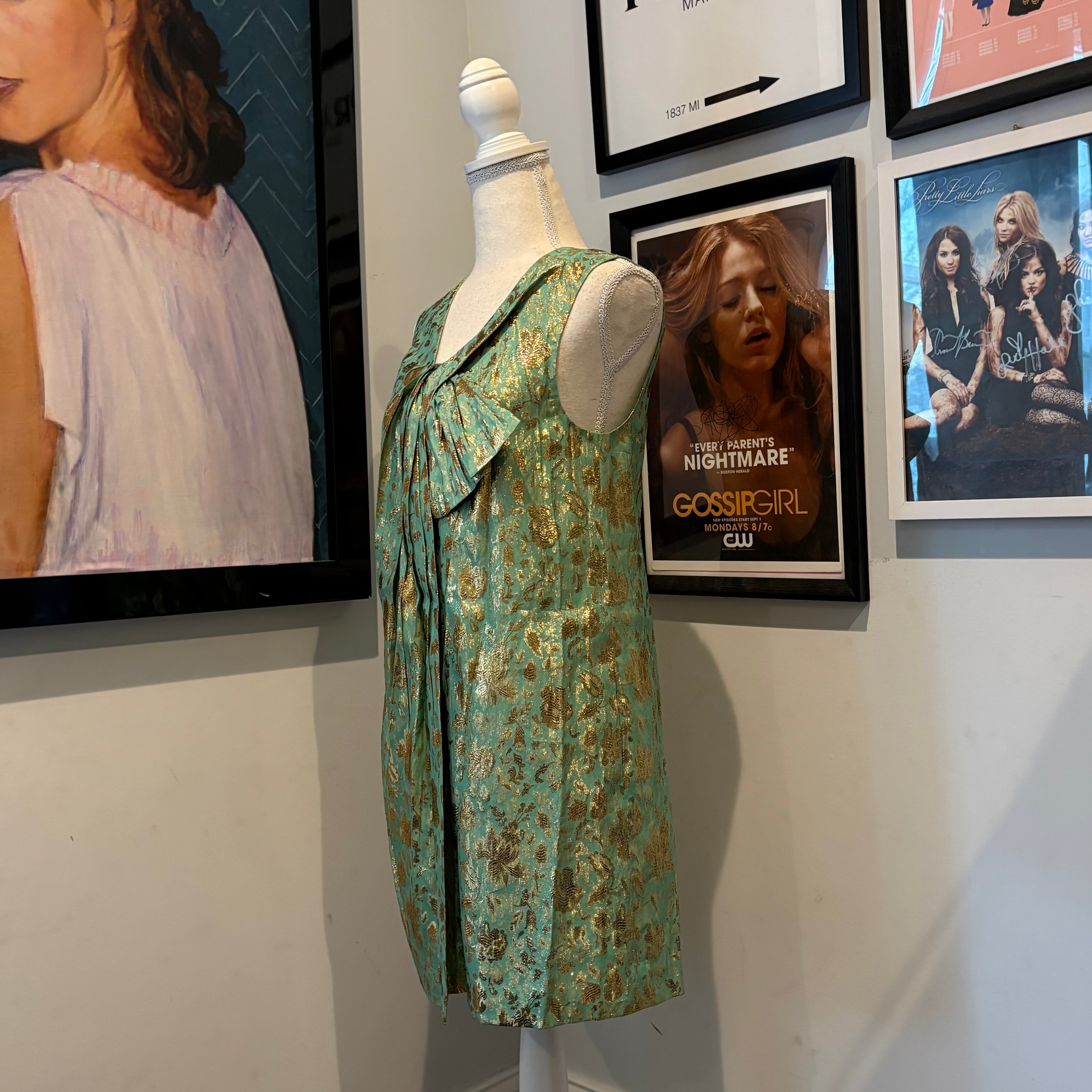 Originally released in the late 2000s, the dress blends mint silk with metallic gold detailing, finished with an exaggerated front drape that feels unmistakably Blair: romantic, dramatic, and just a touch theatrical. It embodies her early-series wardrobe at its peak — feminine silhouettes with a regal tilt, every fold reinforcing her status as the Upper East Side’s reigning aesthete. Pieces from this period are especially rare, and this one is a true collector’s gem.