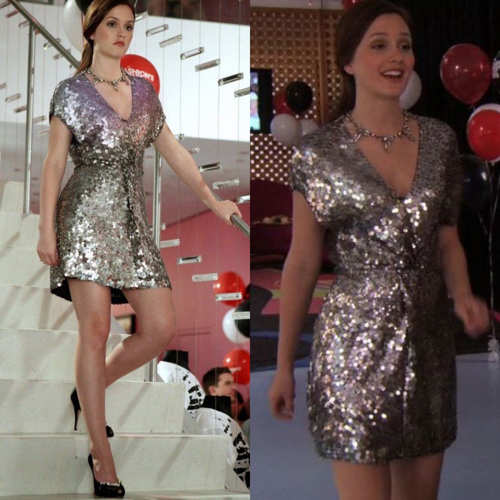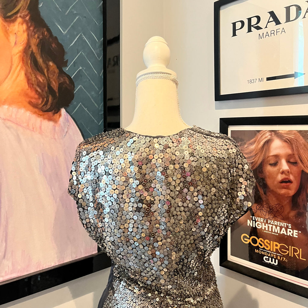An Upper East Side treasure. This original Valentino silver sequin mini dress was worn by Blair Waldorf (Leighton Meester) in Gossip Girl Season 4, Episode 3, “The Undergraduates,” during the Fashion’s Night Out party — one of the most iconic crossovers between the Gossip Girl universe and real New York fashion history.