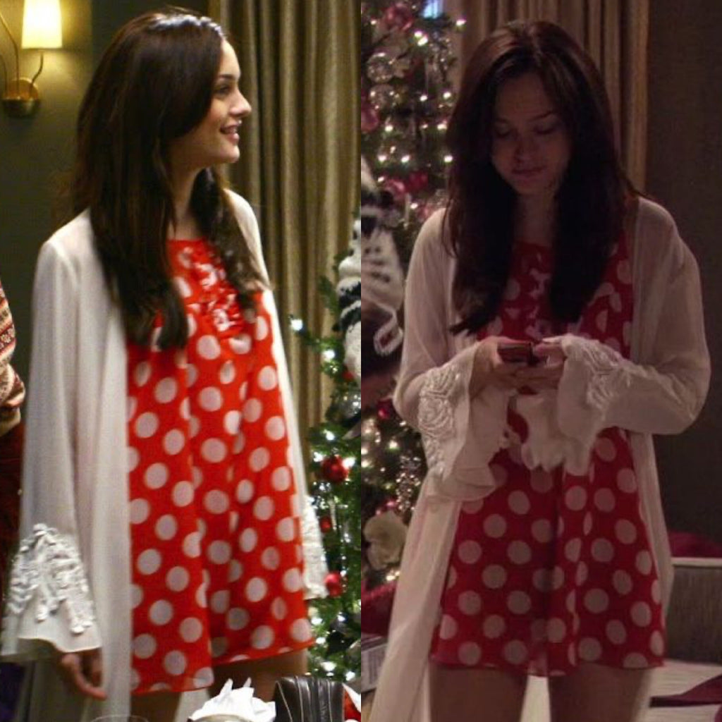The bold red silk scattered with oversized white polka dots was Blair’s pick for the Archibald holiday drama — a look equal parts sweet and sly, as only Queen B could pull off while unwrapping secrets (and presents). Styled with her embroidered robe and an eye-roll or two, it’s a Gossip Girl deep cut that captures the cozy-meets-chaotic energy of early Blair.