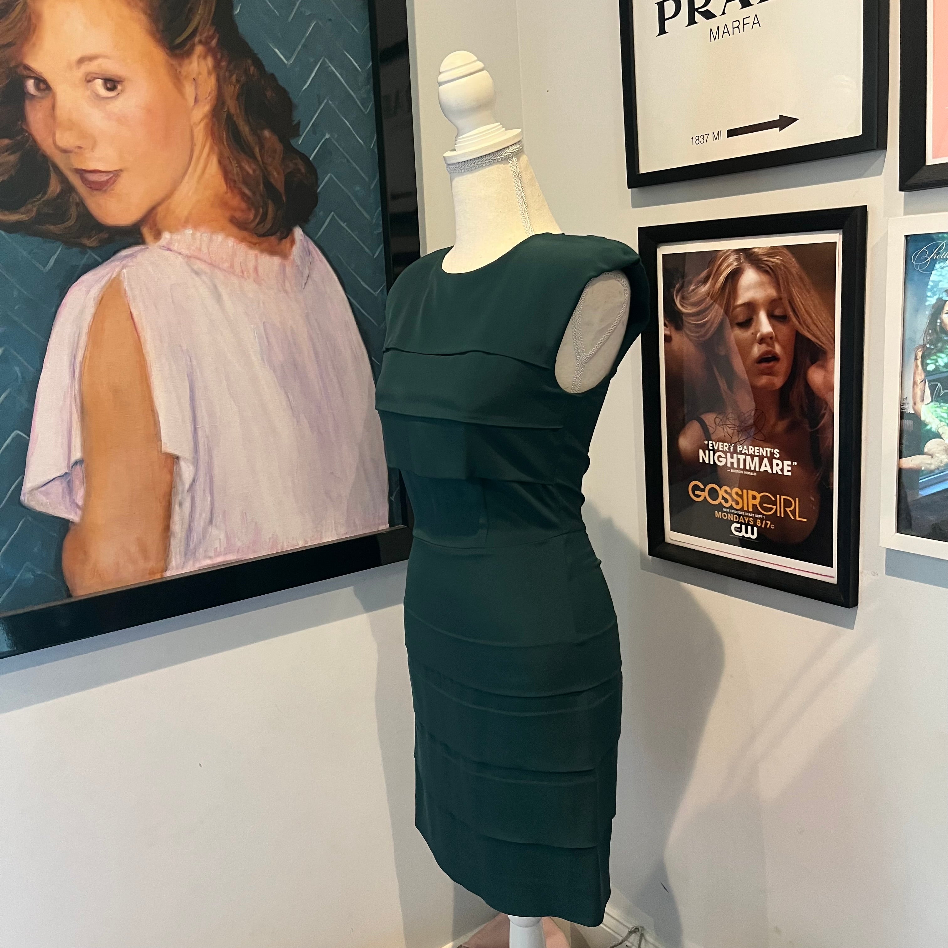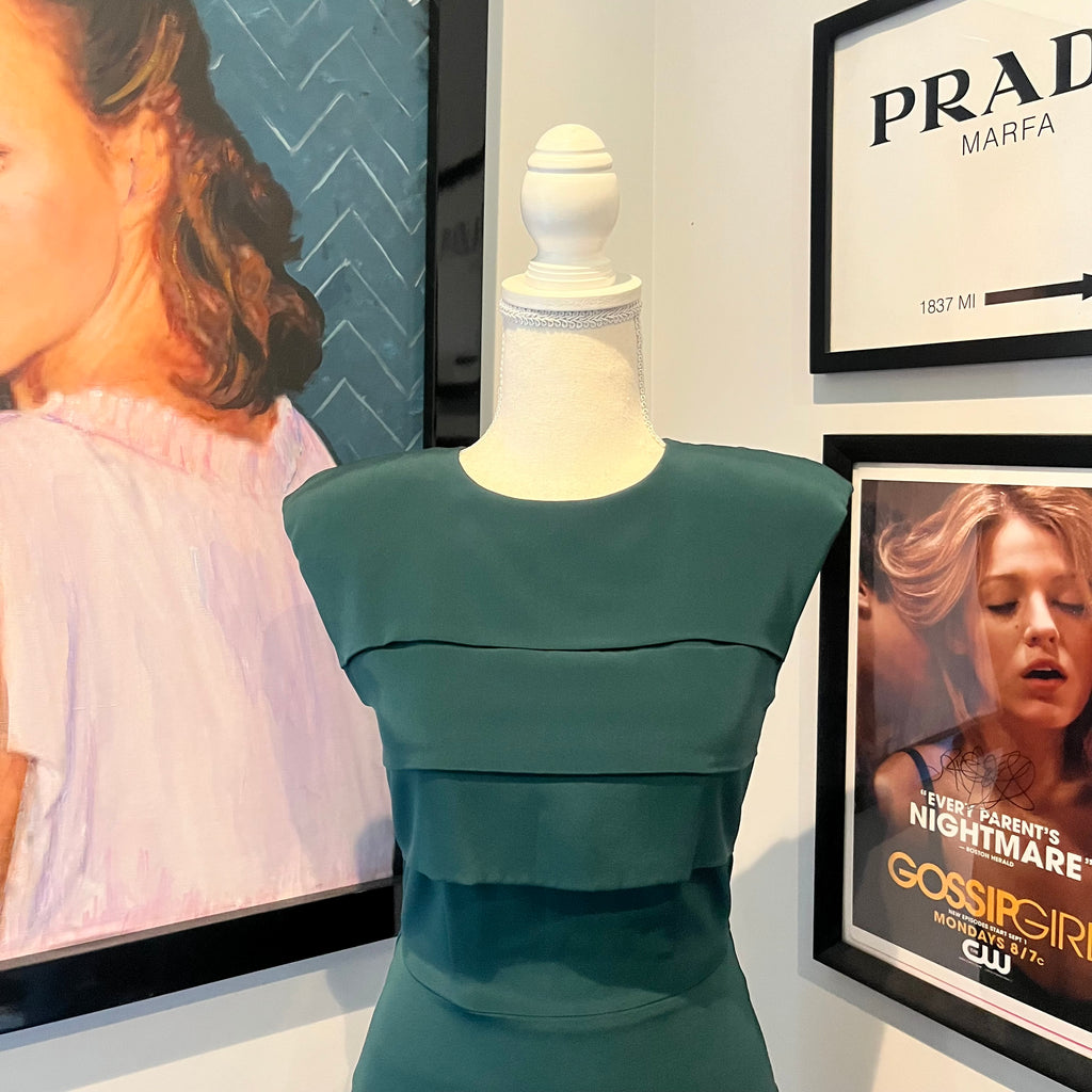An Upper East Side classic. This original forest green L’Agence structured mini dress was worn by Serena van der Woodsen (Blake Lively) in Gossip Girl Season 4, Episode 11: “The Townie,” while helping plan Blair Waldorf’s Tiffany-blue bridal shower with Prince Louis.