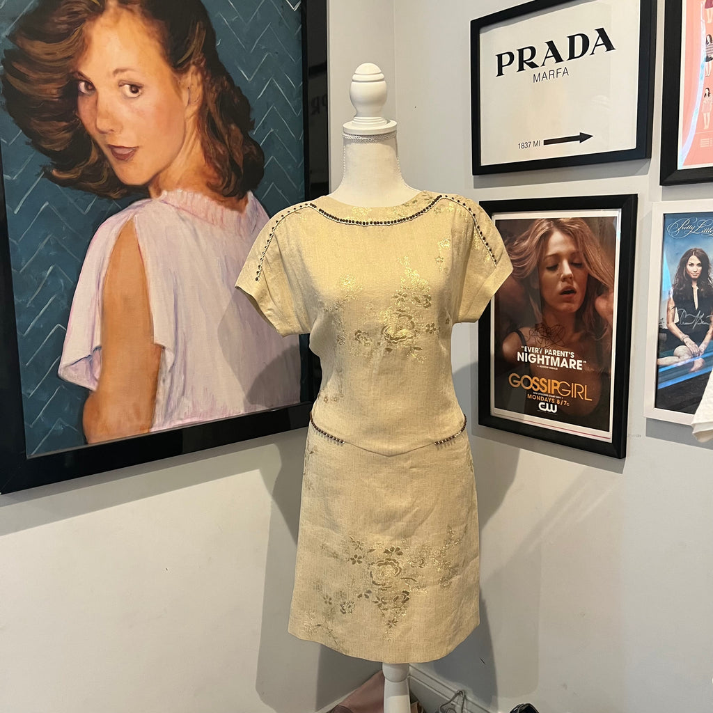 Originally released circa 2007, this easy yet elevated silhouette is cut in soft gold linen with metallic floral embroidery and delicate grommet detailing along the neckline, sleeves, and hips. It’s pure Serena: effortlessly glamorous with a bohemian-gloss edge.