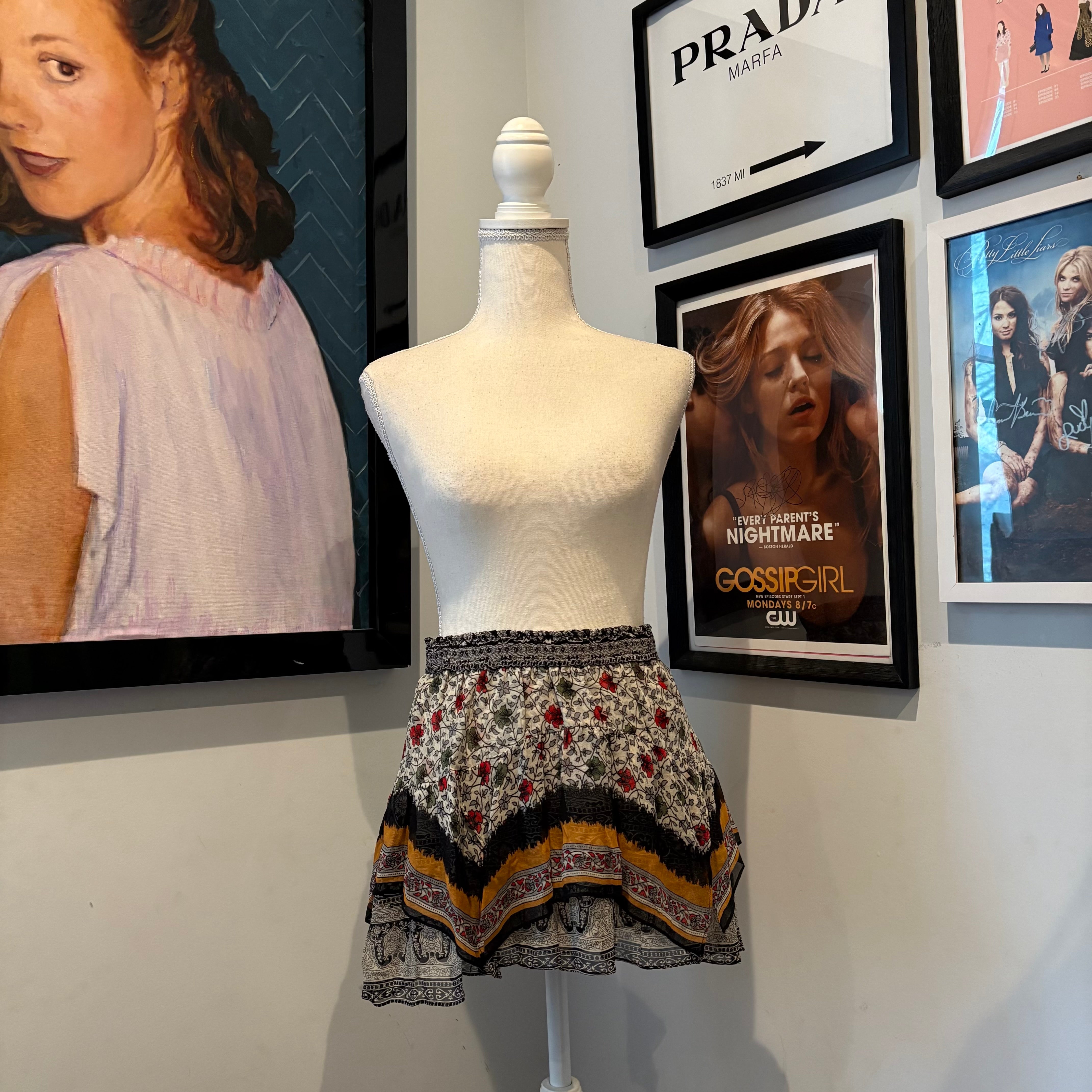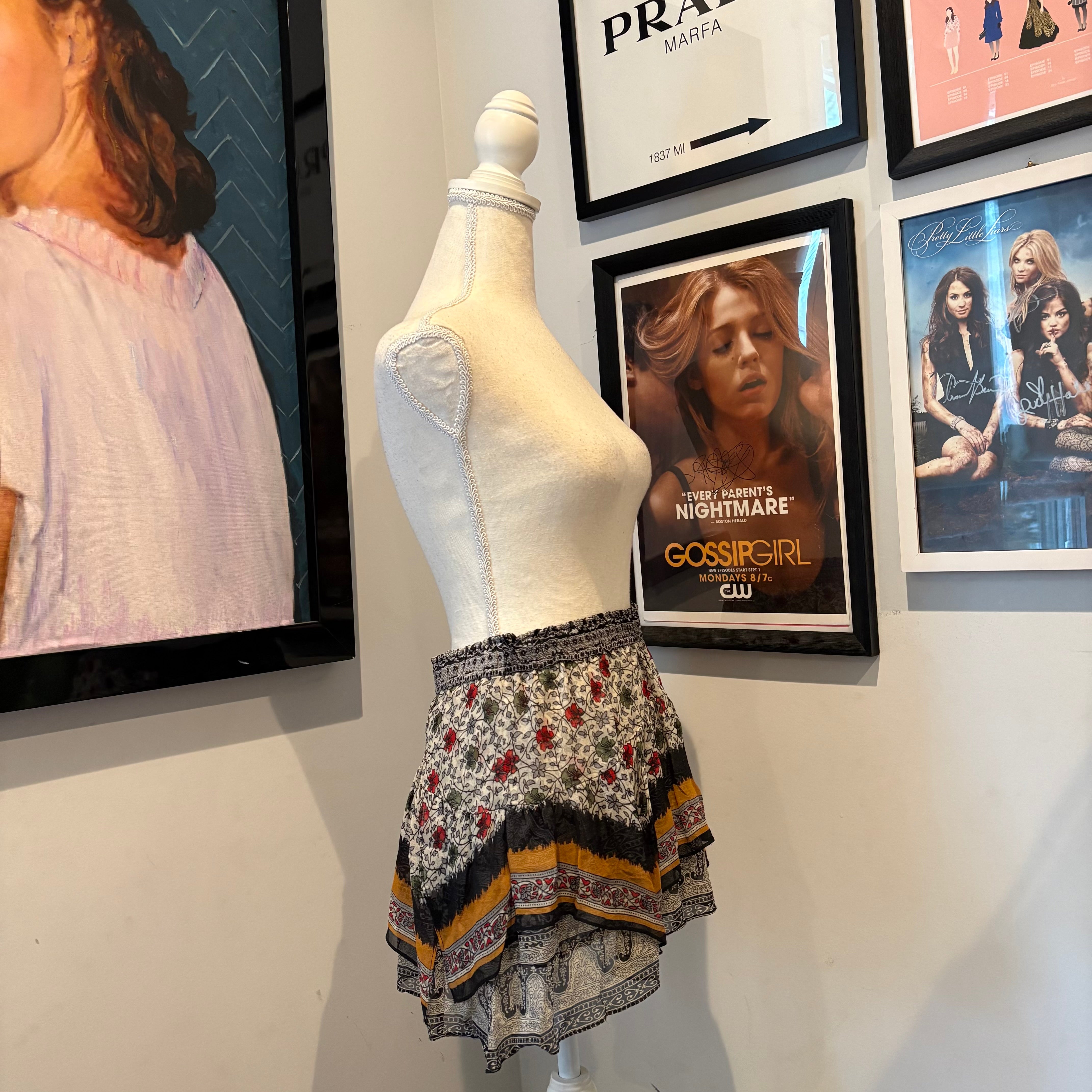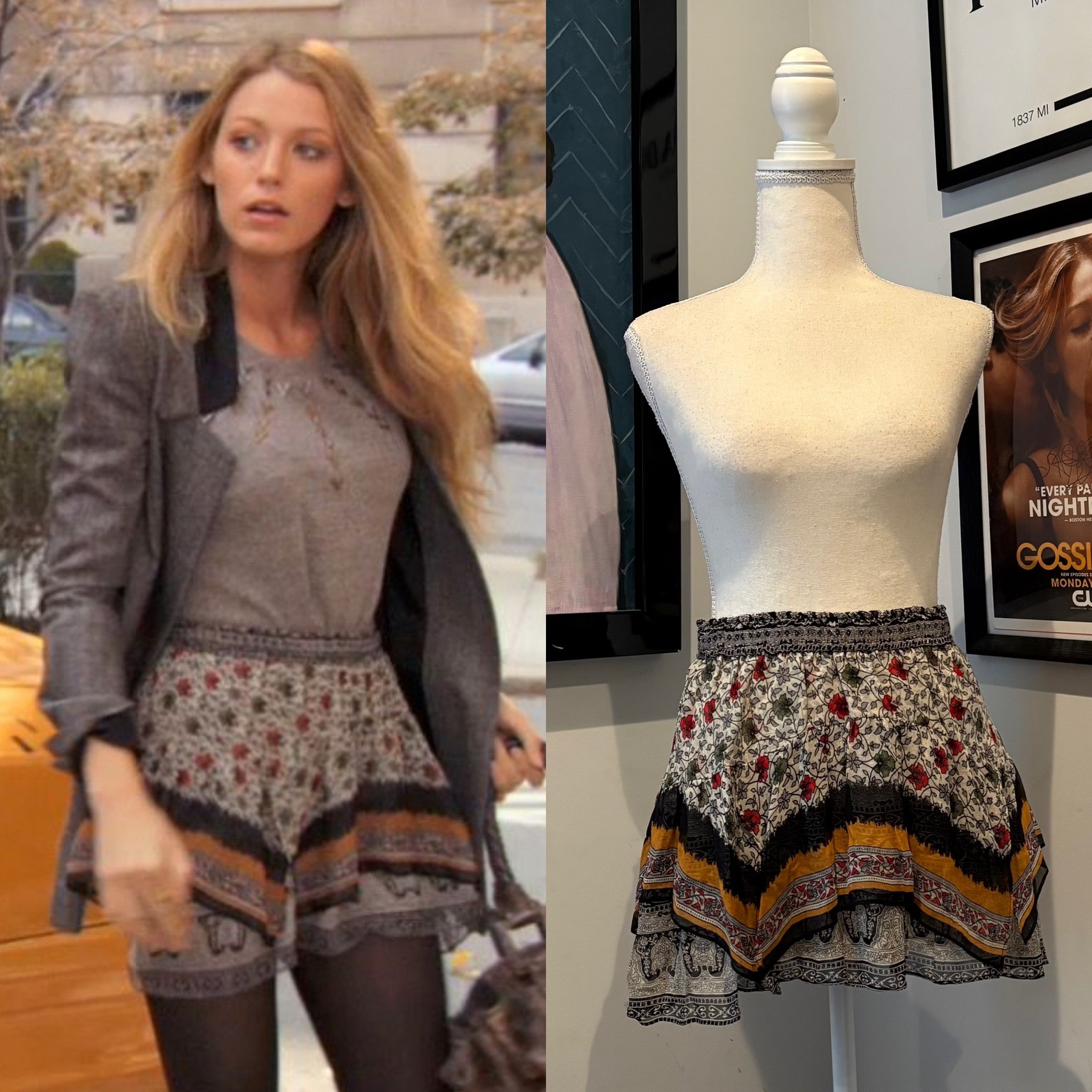 An Upper East Side classic. This original Of Two Minds printed skirt was worn by Serena van der Woodsen (Blake Lively) in Gossip Girl Season 4, Episode 8, when she turned a simple fall day on the Upper East Side into a full-blown street-style moment.