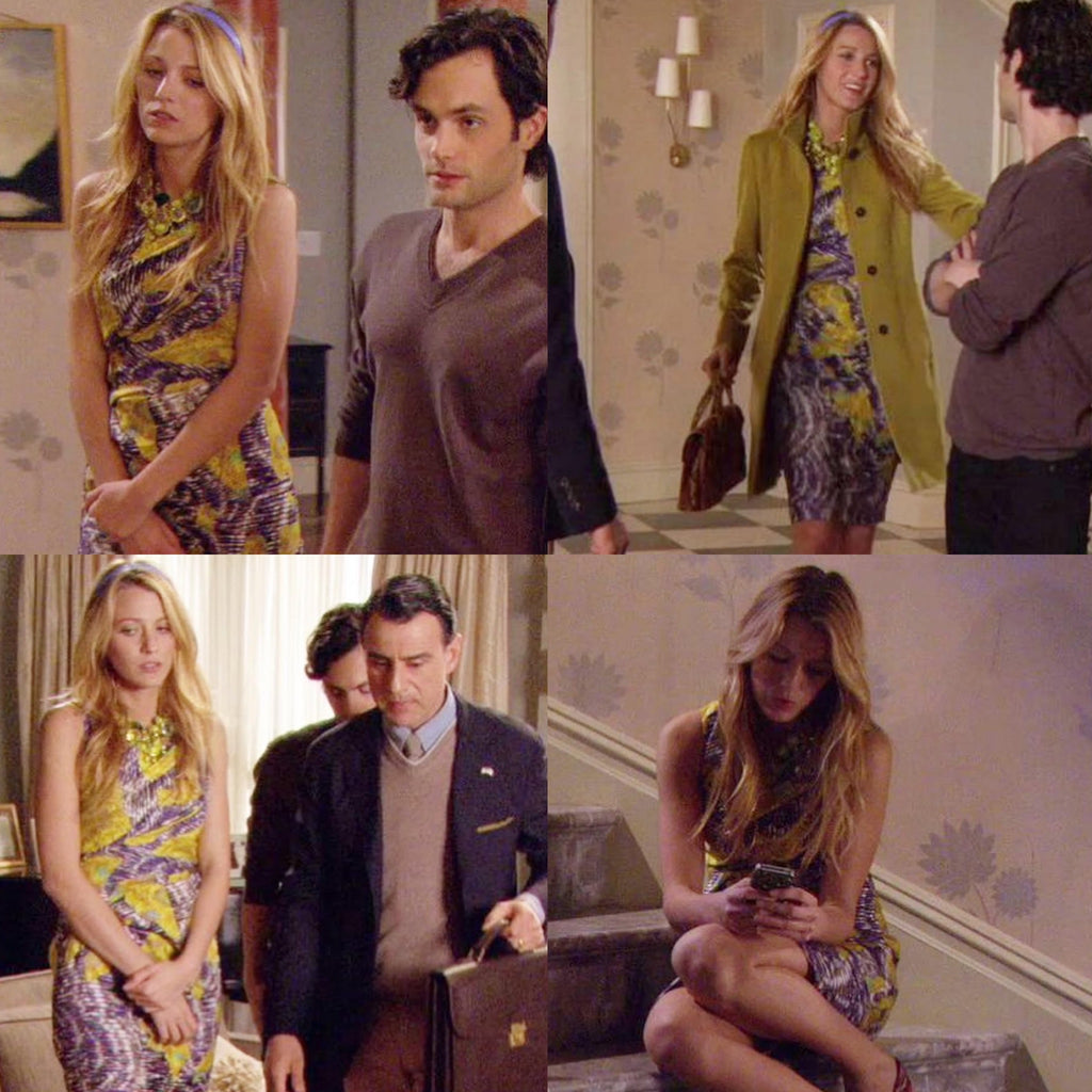 Originally released circa 2011, this architectural silhouette fuses bold citron and violet prints with Pilotto’s signature folds and sculptural layering. The look captures Serena’s rare moment of restraint, sharpened with Blair-coded polish, yet still humming with her free-spirited chaos.